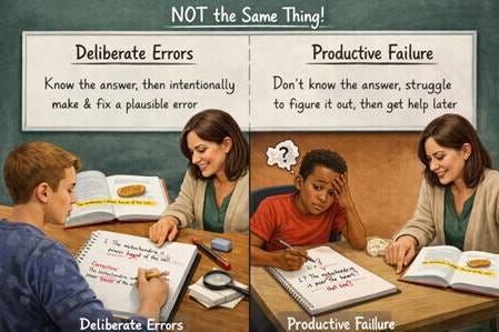 This difference matters. While productive failure relies on learners learning from not knowing, deliberate errors rely on learners learning by differentiating what they know from what it isn’t. The former assumes that schema construction can begin through failure while the latter assumes that schemas are already present and can be sharpened through contrast.
